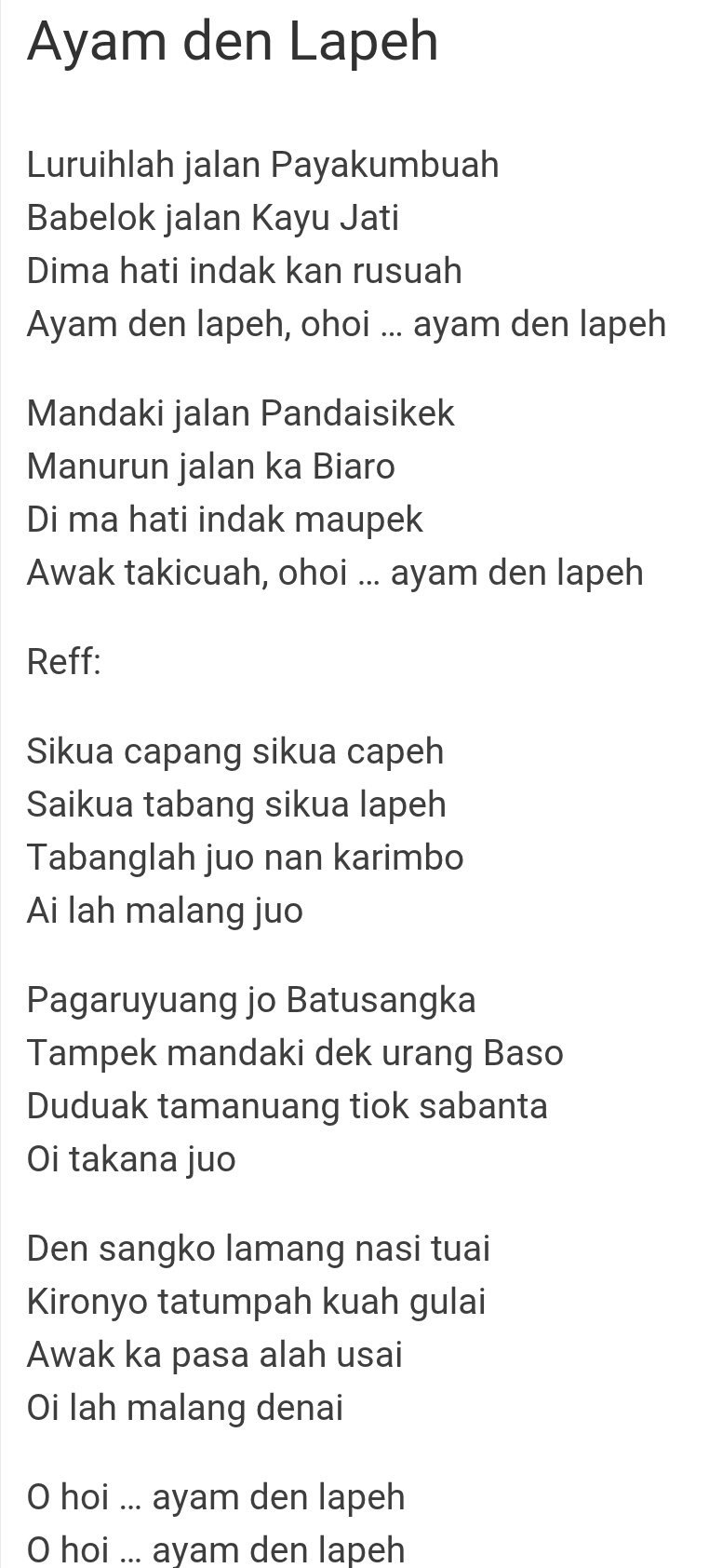 . 99 lagu tradisional Ayam Den Lapeh berasal dari Sumatra Barat dan sempat populer di tahun enam puluhan. Ayam Den Lapeh berasal dari. Luruihlah jalan payakumbuah Babelok jalan kayu jati.